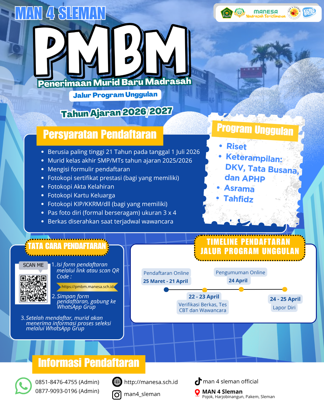 - Jalur Reguler, untuk siswa sekolah Luar Daerah DIY (tidak punya nilai TKA/ASPD) melalui link: pmbm reguler LUAR DIY
